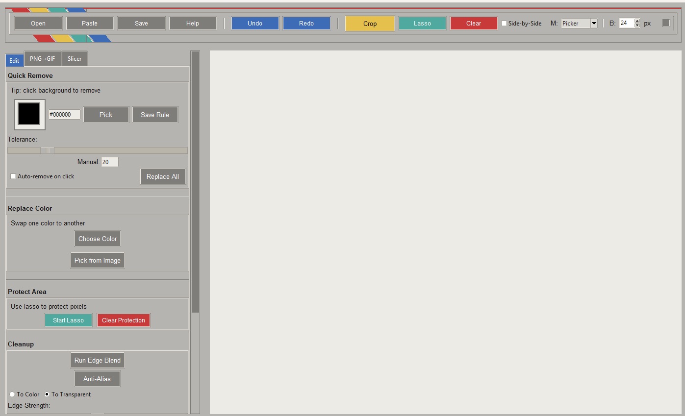 This is a simple tool for removing backgrounds from images (not with AI) in a way that gives you more direct control. It also has features for slicing frames from an image and also for creating gifs. It also can export as jpg/png/ico. There's a few other features such as a lasso tool for protecting content from being removed and things like that. There is a help button in the app with all relevant info.